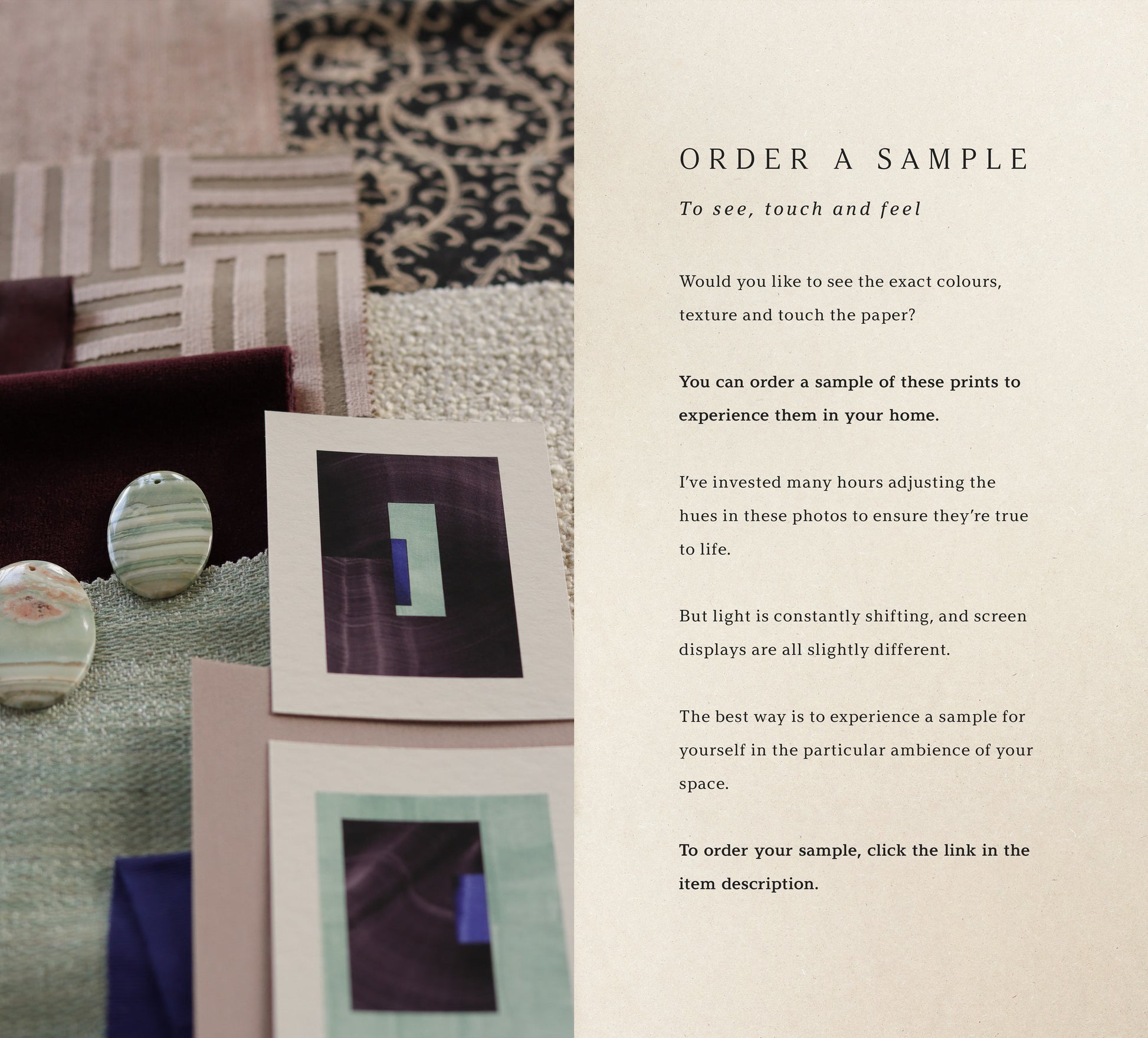 Click here to order a sample of this print and see the exact colours in your home.