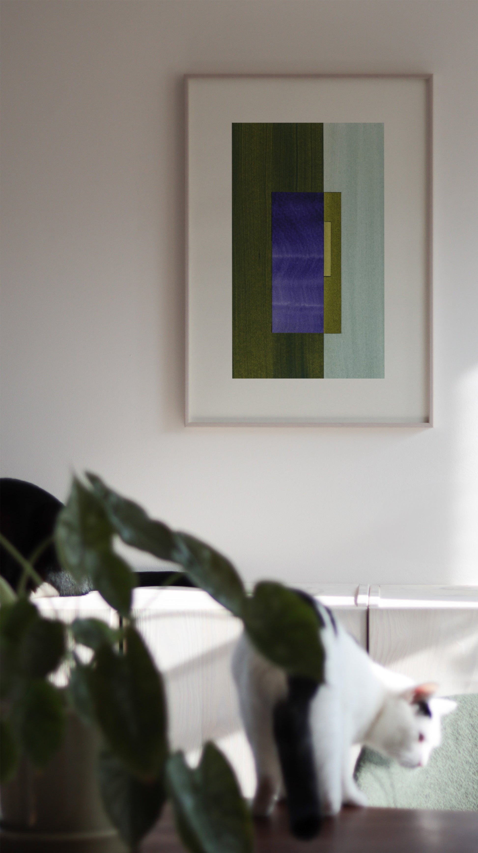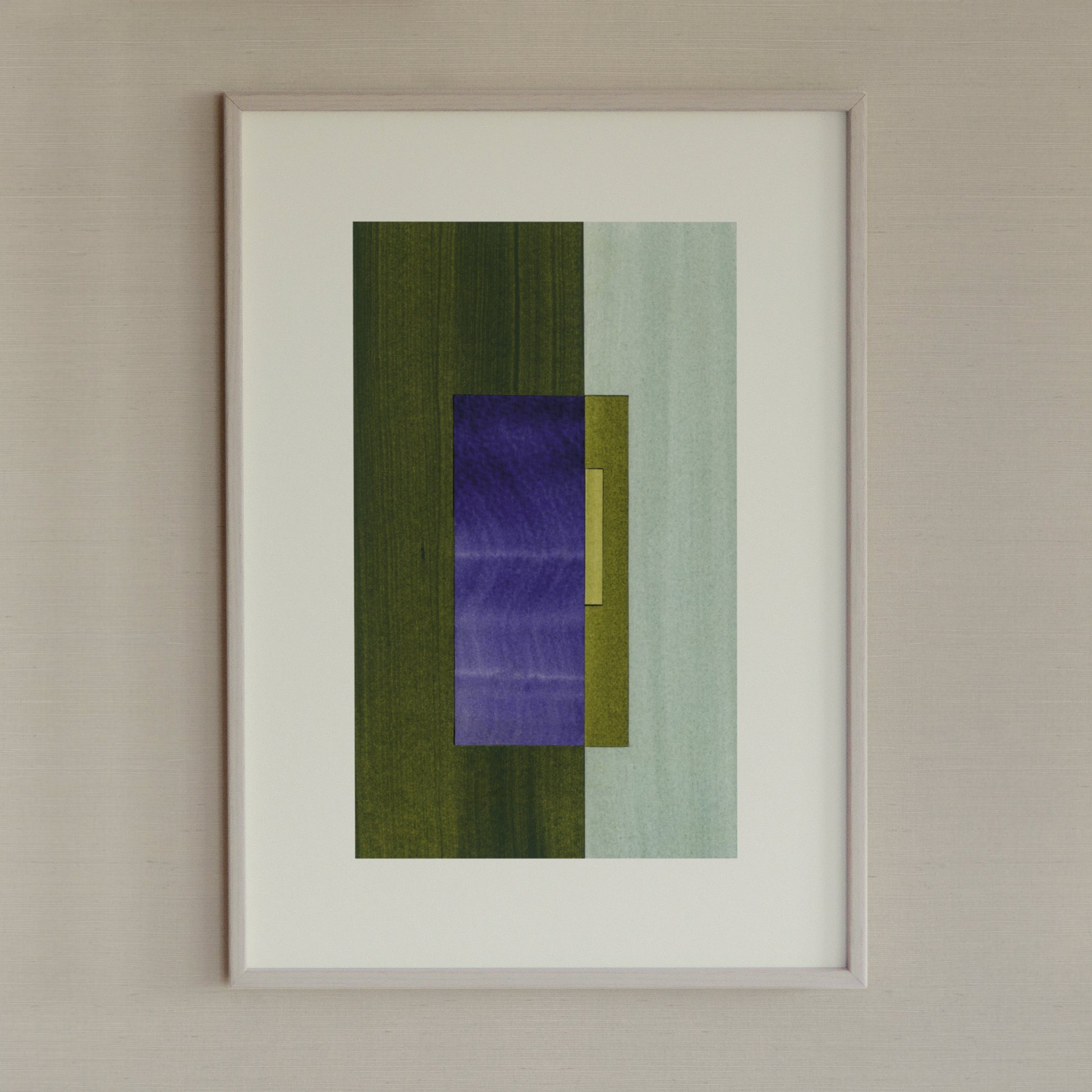 - Dark olive, royal blue-purple, aqua, moss green, and lichen yellow wall art.